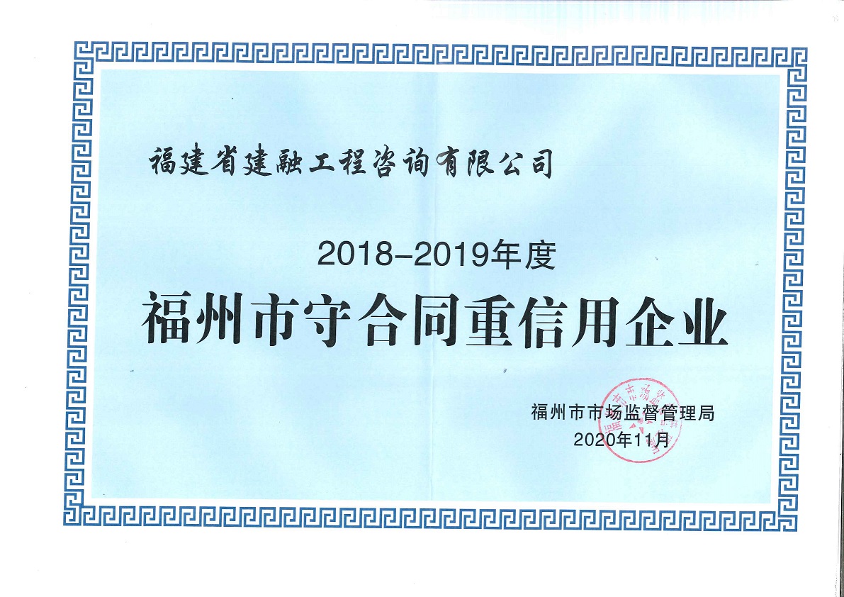 建融公司获得2018-2019年度福州市守合同重信用企业